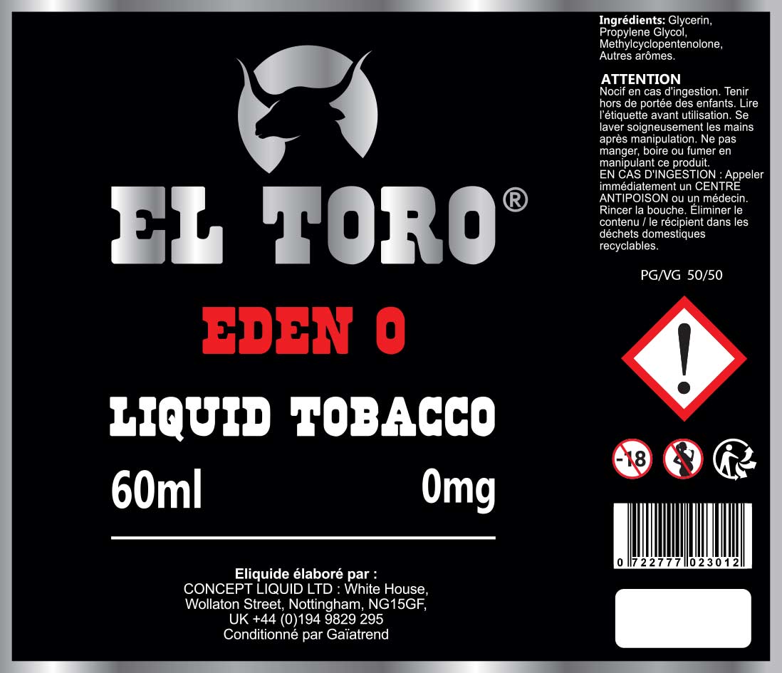 Le contenu est simplement le El Toro Eden en 00mg, sans être sur-aromatisé, nous vous conseillons de le booster avec du El Toro Eden en 19mg afin de conserver toute sa saveur originelle.